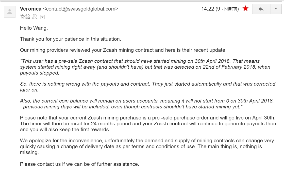 終於,調查結果出來了,整個鬆了一口氣。原來 Genesis 認為我的 Zcash 合約在購買當天立即被啟動挖礦是個錯誤,它認為這應該是 4/30 才開挖的預購合約。在 2/22 那天因為到了要出金的門檻,而被偵測到有錯誤,所以停止了挖礦及出金,所以交易紀錄沒再更新是正確的。