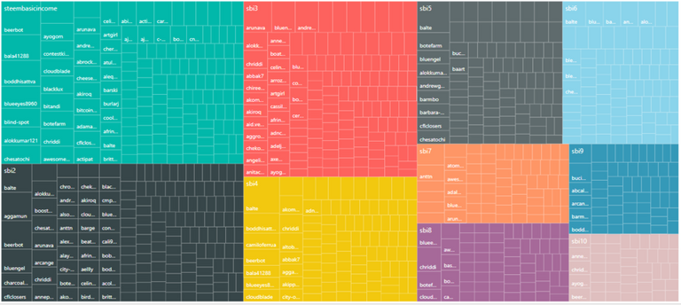 This shows the total number of upvotes (without respect to size) delivered in the last week. 7688 total upvotes, 2487 accounts upvoted, 10 voting accounts! The biggest boxes belong to members that have a high enough SBI subscription level to get regular upvotes that exceed the minimum threshold.