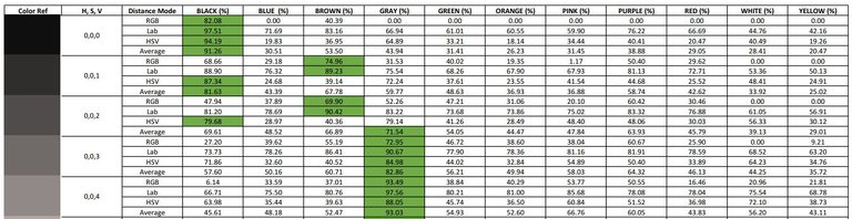 The measurement of each sample shade is compared using 3 different comparisons, namely RGB (low-cost estimation of Luv distance), HSV distance, as well as LAB distance. The "Average" score is also provided as a means to see how much the data varies among the 3 different distance measure functions.