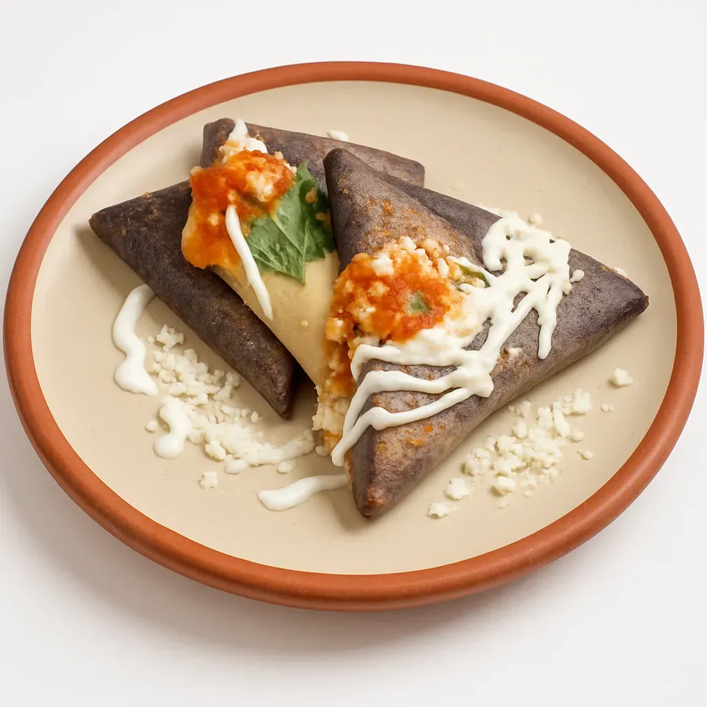A traditional Oaxacan delight consisting of triangular masa pockets filled with a savory mixture of refried beans, potato, and chorizo, topped with Mexican cream, Cotija cheese, and salsa.