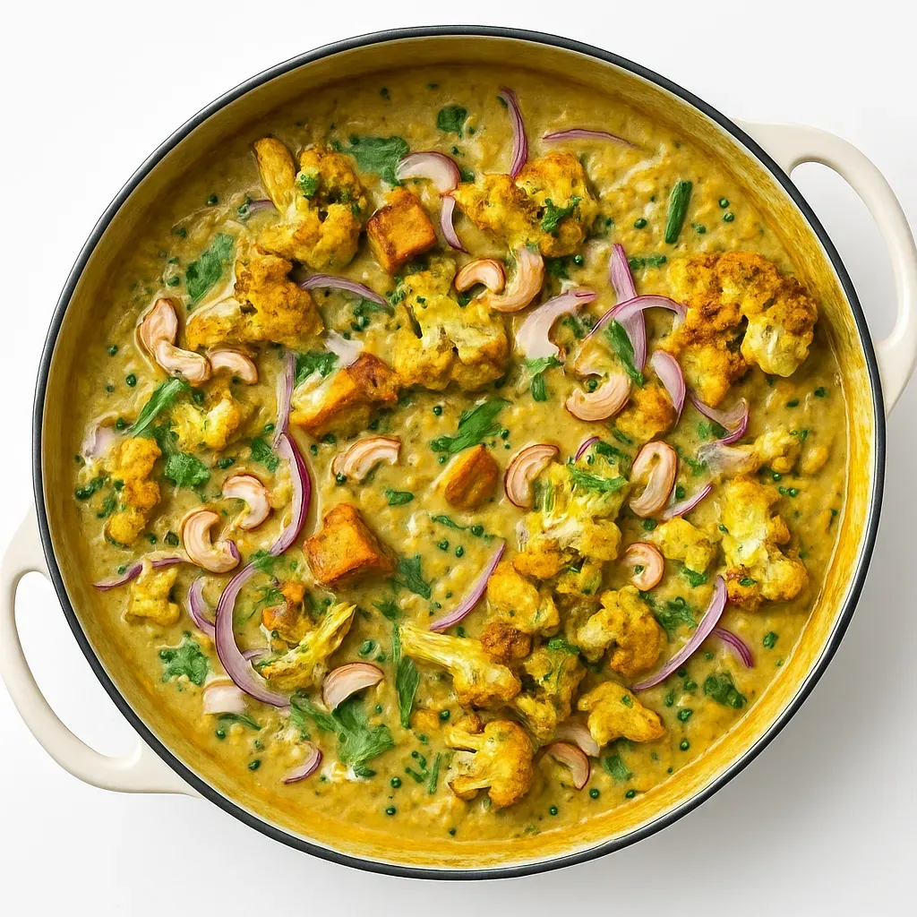 A flavorful, Indian-inspired korma featuring high-protein lentils and tofu, paired with roasted cauliflower and aromatic spices for a satisfying meal.
