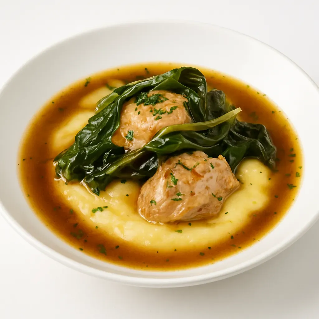 A traditional Brazilian chicken stew combined with nutritious Ora-Pro-Nobis leaves, perfect with creamy polenta.