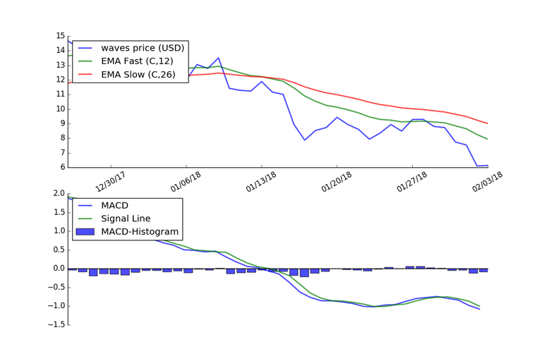 The graph below shows the MACD applied to the price of Waves using daily price data for the last 40 days.