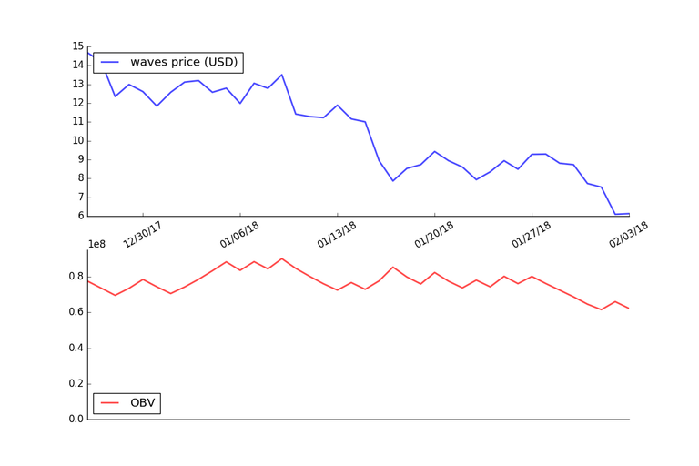 The graph below shows the OBV applied to the price of Waves using daily price data for the last 40 days.