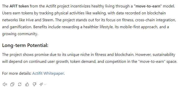 I came to Actifit because of another move-to-earn project that's recently blown up here but too many red flags for me so I searched for an alternative. Chat gpt has been helpful in cementing my support here. I'm already 1000% sold but it's still good to research.