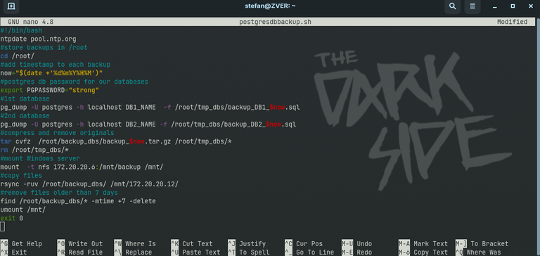 Now that we know these commands We can easily create a bash that will backup 2 postgres databases from the server and upload them to the backup Windows server while keeping 7 backups locally.