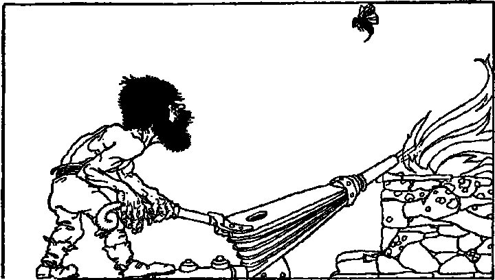 The brothers went into the forge, it was dark and dirty lit only by the orange glow of the coals. Eitri went over to the bellows, “alright Brock, you work the bellows, nice and steady and don’t stop until I yell up to ya, it has to be a steady heat, a fraction too hot or too cold and it will ruin everything.” Brock nodded. Eitri watched until the glow of the forge was where he wanted it and headed for the door that led to the forge itself. He grabbed a pigskin from off the wall. “I’ve been saving you for something like this...” He said. And as he walked out the door a big black fly flew in on his way out. It buzzed the room somewhat maliciously and landed on the wall. This was no ordinary fly, this was Loki. He had the power to change his form into almost anything. But for an occasion such as this, a fly would do.