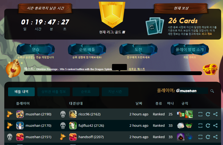 에픽하고 골드 카드가 몇장인가 나오긴 했지만, 애초에 보상 카드들이 그다지 값어치가 나가는 카드들이 아니다 보니 시즌 내내 꾸준히 일퀘를 했음에도 불구하고 별로 나아진 것이 없는듯한 느낌입니다.