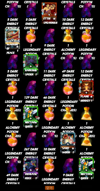 [스몬] 27번째 시즌 종료. 챔피언2muzehan (55)in #zzan • 5 years ago 이번 시즌은 챔피언2 리그로 끝을 맺었습니다.최근엔 거의 챔피언2 리그로 끝이 나네요.별달리 과금하지 않는 소과금 유저인 저로서는 이쯤이 한계가 아닌가 싶습니다.그래도 챔피언2 리그의 보상은 120개나 되기 때문에 제법 쏠쏠하죠.하지만, 120개나 되는 보상중에 언템드 팩 2개 외에는 별다른게 없네요.와... 120개 중엔 118개가 꽝이라니...저야뭐 본전은 이미 예전에 확보 했으니 보상이 적더라도 그러려니 하지만, 최근에 과금한 사용자라면 참 속쓰릴것 같습니다.다음 시즌엔 뭔가 새로운 컨텐츠라도 업데이드 되어야 할텐데... #atomy #steemzzang #spt #kr