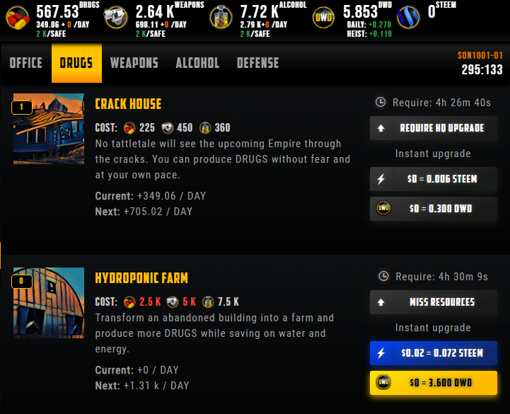 [게임 : DrugWar] 영지를 늘렸다.son1001 (51)in #zzan • 5 years ago 후하하하... 영지를 2개 늘려서 총 3개의 영지를 가지게 되었다.아무런 투자없이 맨바닥으로 시작하다보니 진행이 좀 느리긴 하네.예전에는 5개의 영지만 가질수 있었지만 언제 업데이트 되었는지 영지를 10개 까지 가질수 있게 변했다.10개나 되는 영지를 관리하자면 참 번거롭겠지만, 영지는 하나라도 많은게 도움이 되니 가능한한 늘려야지.예전에는 싸고 빠른 유닛들을 이용해 자신의 영지끼리 자원을 옮겨서 하나의 영지를 빨리 발전시키는 꼼수가 가능했지만, 이젠 유닛 이동시 자원을 소모하게 바뀌어서 별 소용이 없다.아직은 개발 레벨이 너무 낮아서 있으나 마나한 수준이지만 그냥 꾸준히 관리만 해줘도 왠만큼은 클꺼다. #atomy #steemzzang #spt #kr